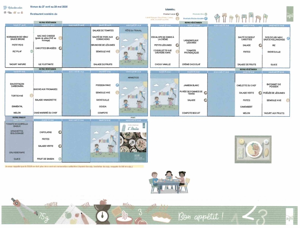 Menus du 27 avril au 3 juillet